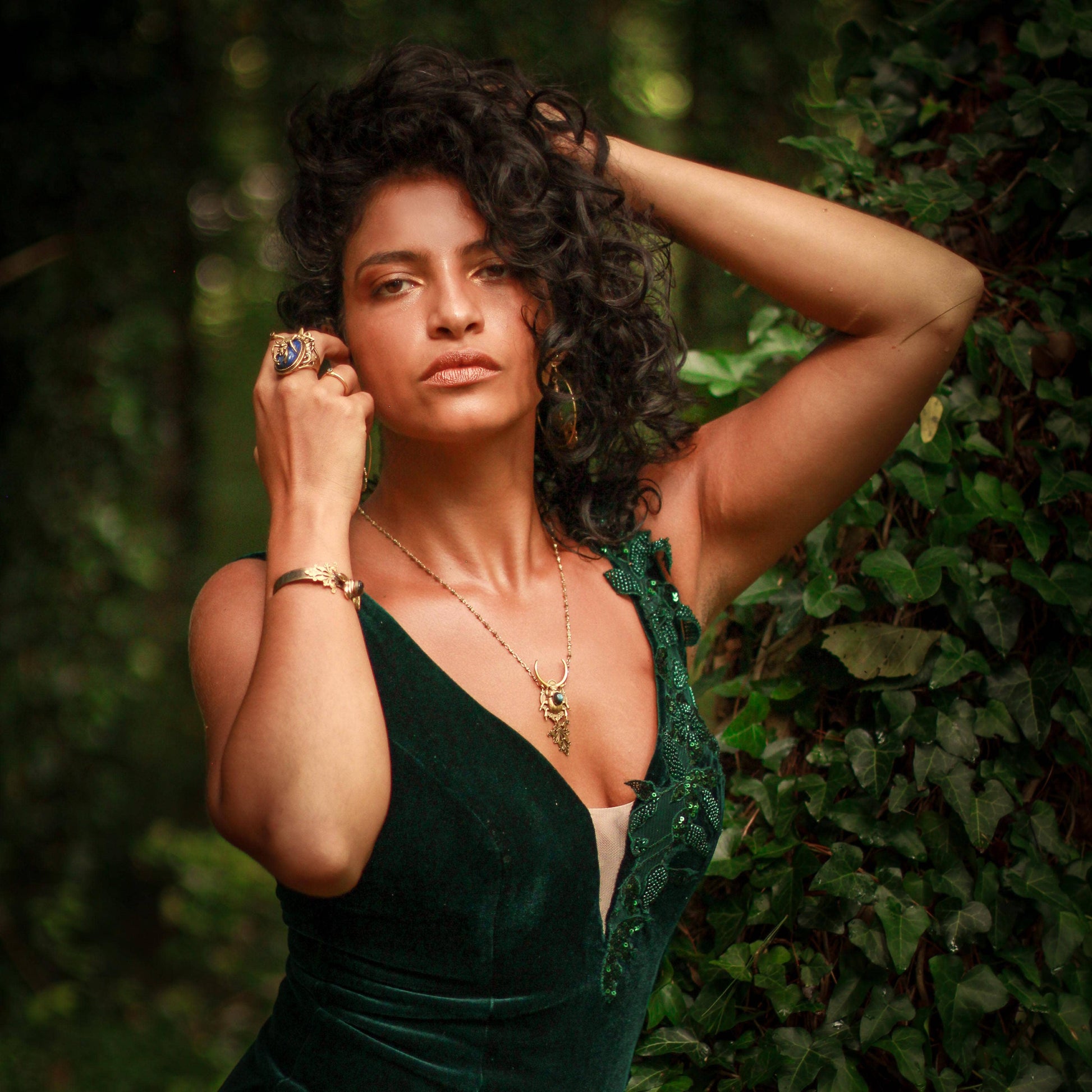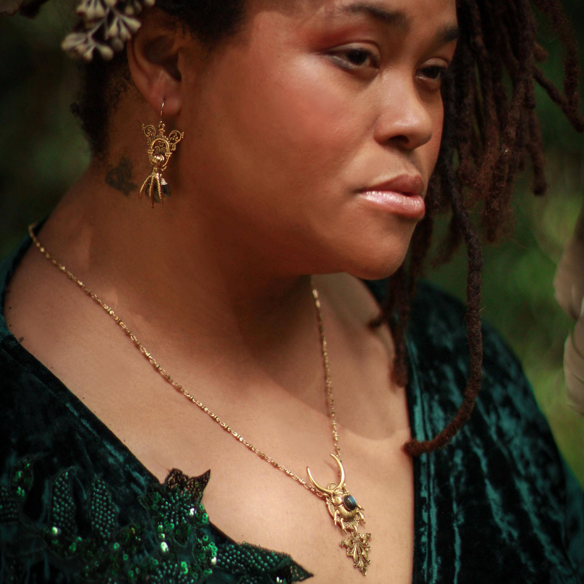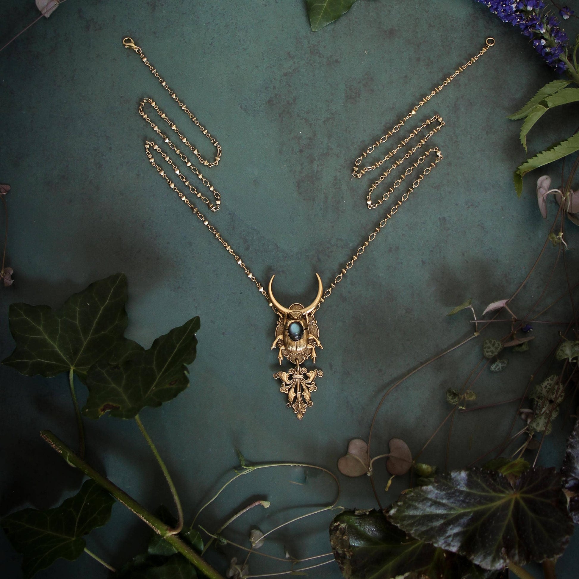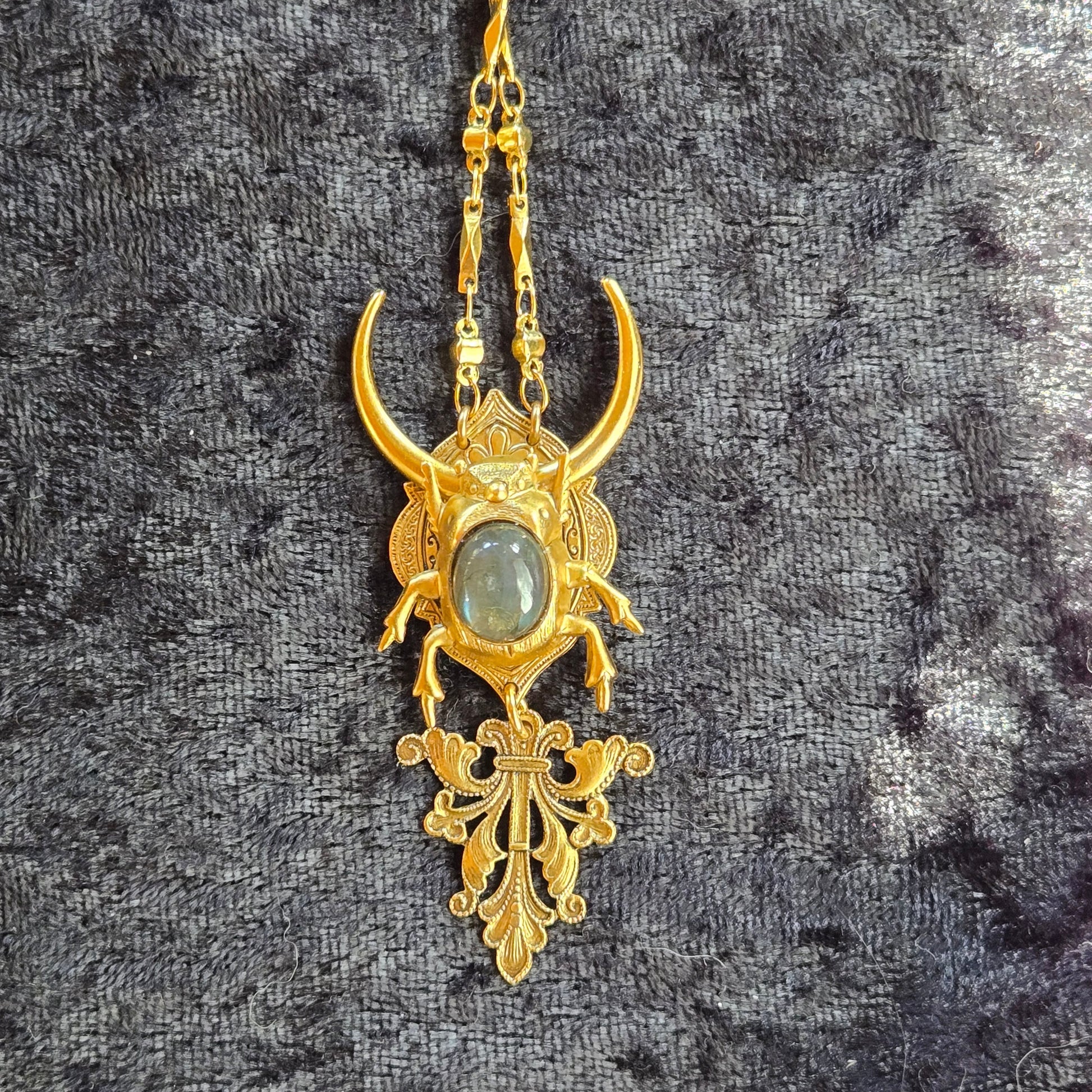 A golden amulet of transformation featuring a noble beetle riding a crescent moon and decorated with flashy gemstone. Whether they're rolling dung through the desert, burrowing under mossy rocks, recycling dead matter or pollinating flowers, all beetles carry codes of change. Embrace the underground in your journey; you need both darkness and light to evolve.