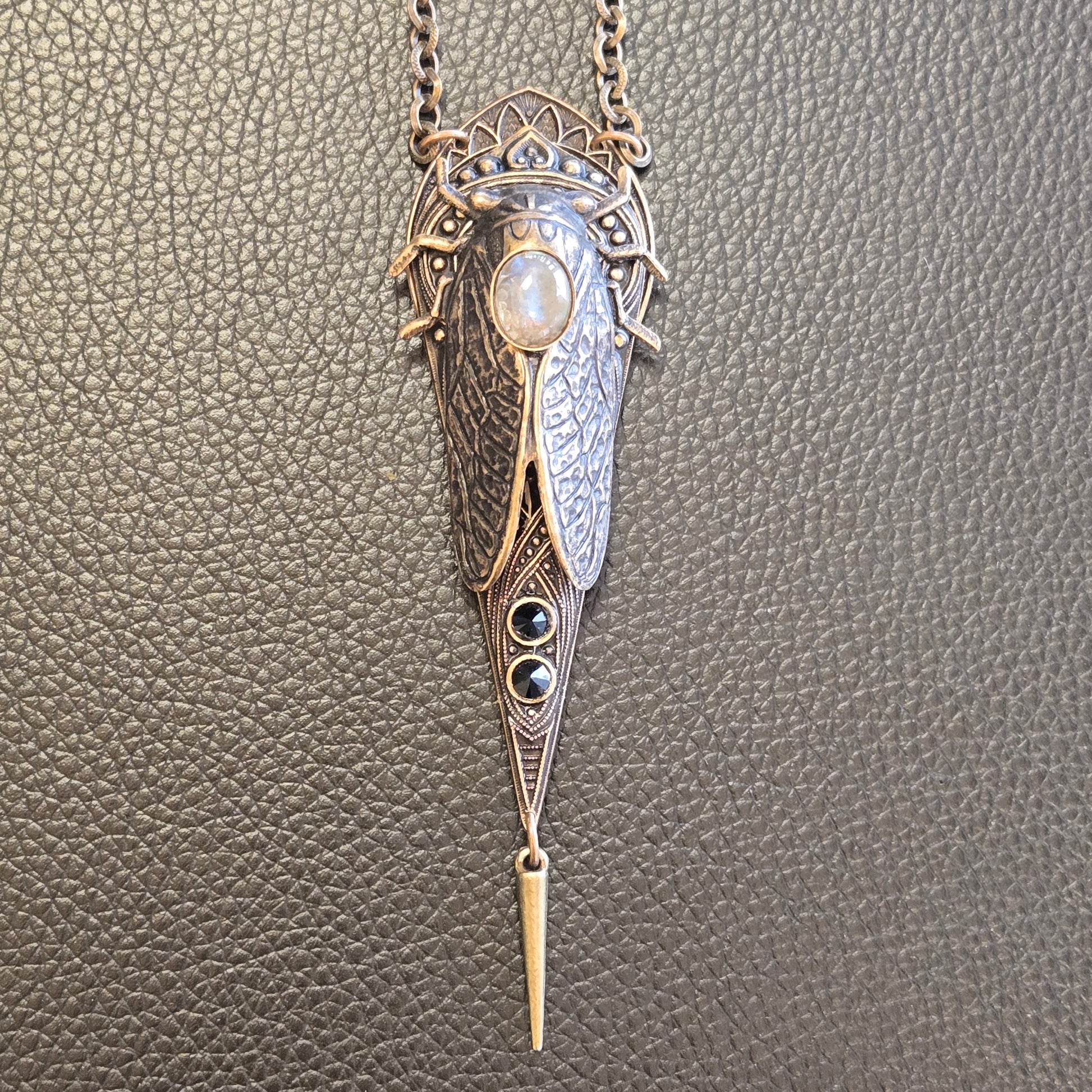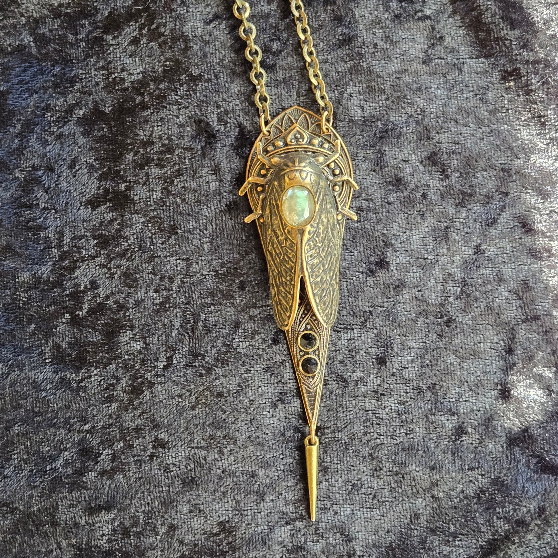 Winged spirit guides embellish a gothic marquis with labradorite and onyx accents. The pendant is finished with a bronze spike.